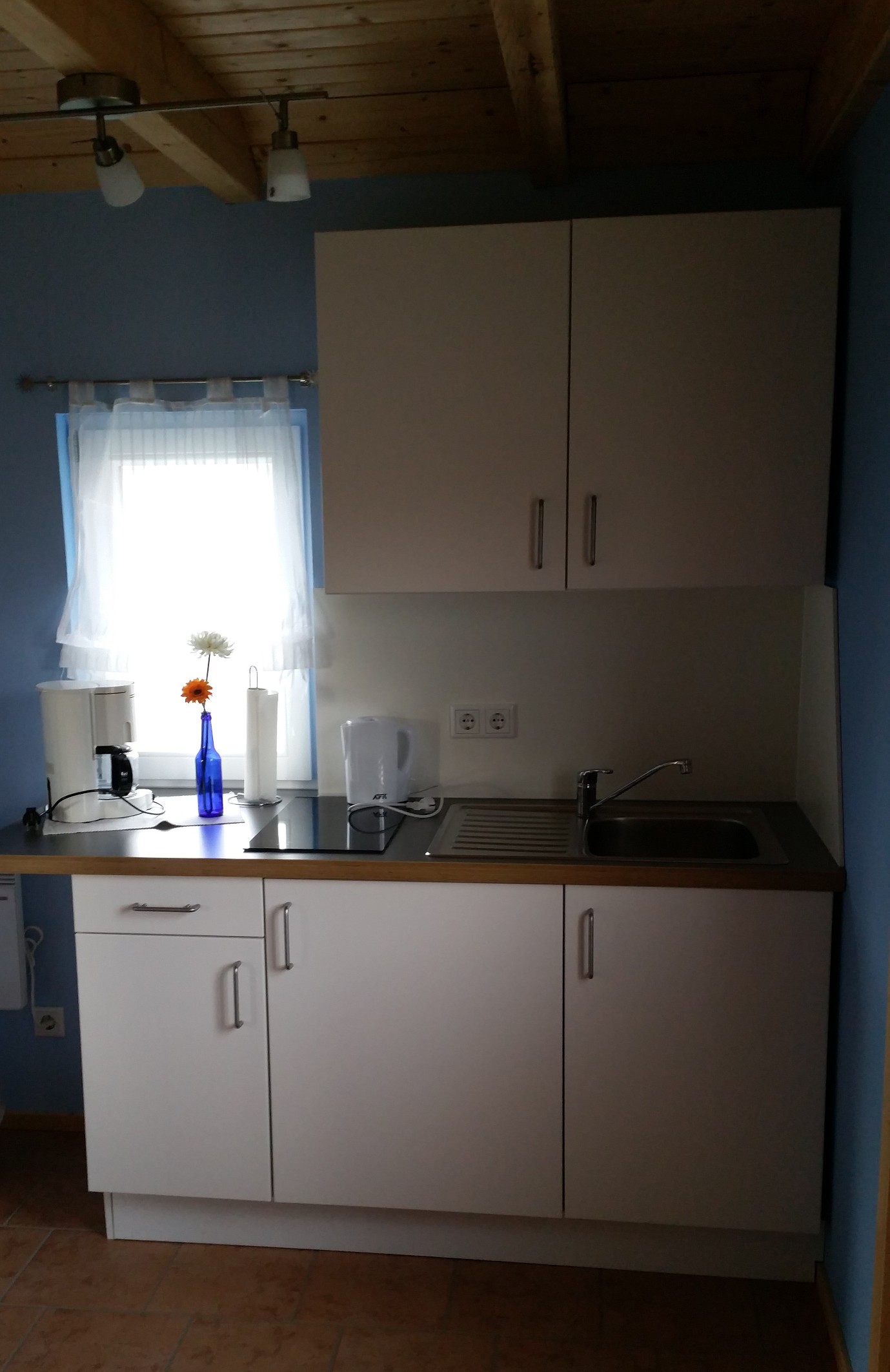 Unser "Blaues" Haus ist im Eingangsbereich mit einer kleinen Küchenzeile mit 2 Plattenkochfeld, Spüle und Kühlschrank eingerichtet. Gut geeignet für 2 Erwachsene mit max.2 Kindern. Das Ferienhaus verfügt über einen Schlafraum mit Doppelbett (1,6x2m), einen Schlafboden mit zwei bezogenen Matratzen, sowie ein modernes, geräumiges Badezimmer mit Dusche und WC. Alle Räume werden mit Elektroheizkörper beheizt, die eine schnelle, angenehme Wärme verbreiten und somit ihren Aufenthalt im Haus auch für die "kältere" Jahreszeit gemütlich werden lässt.