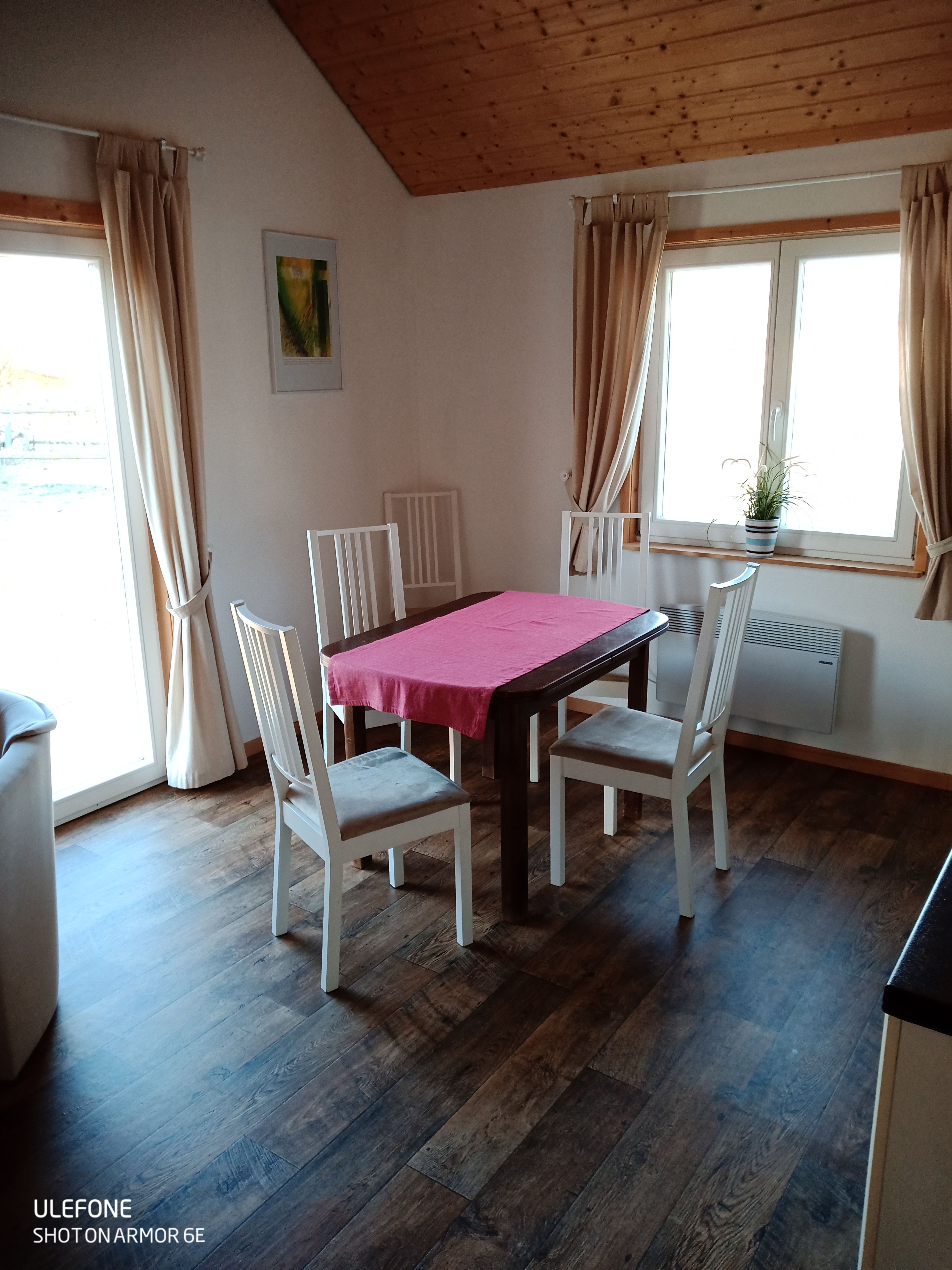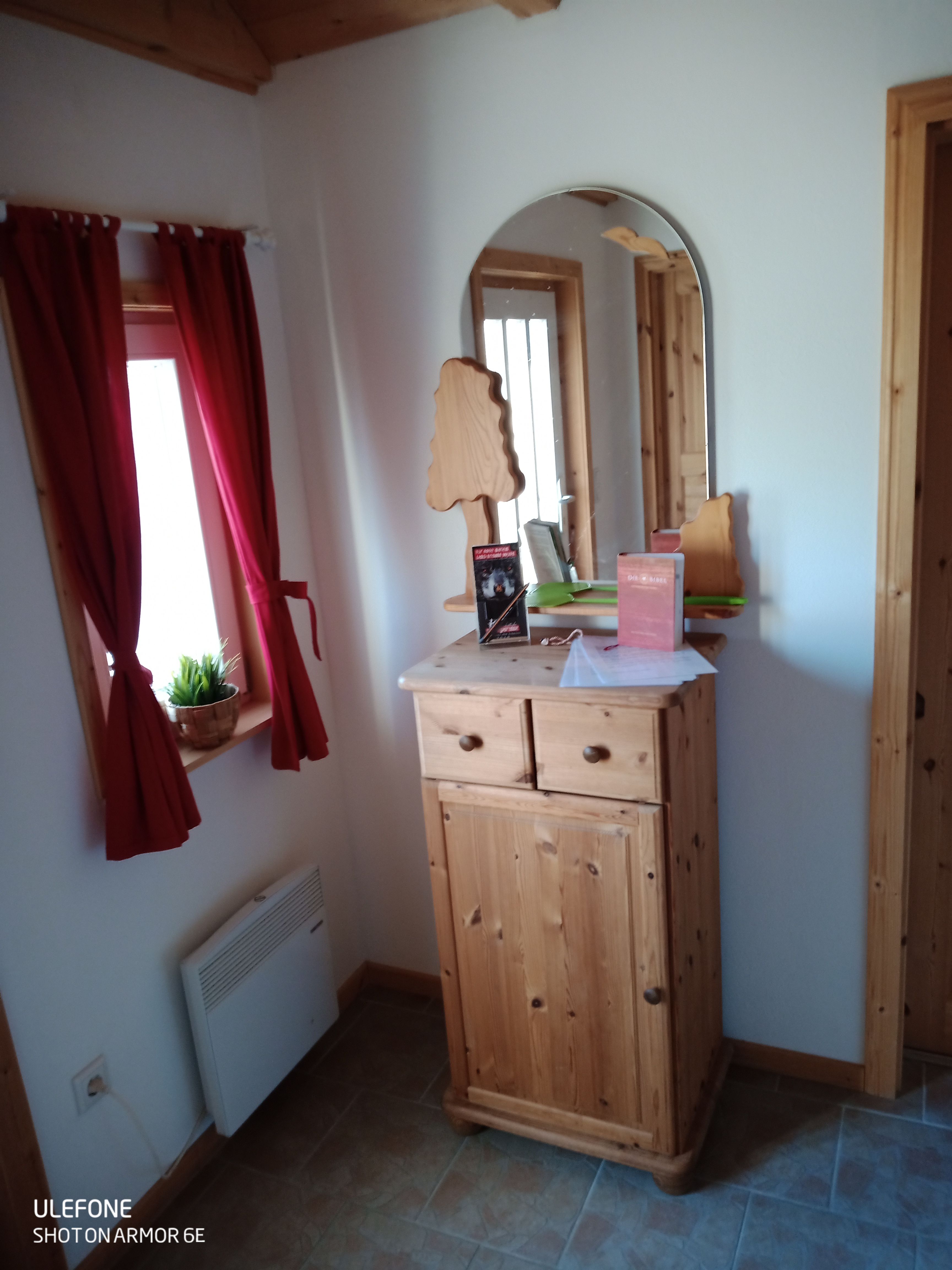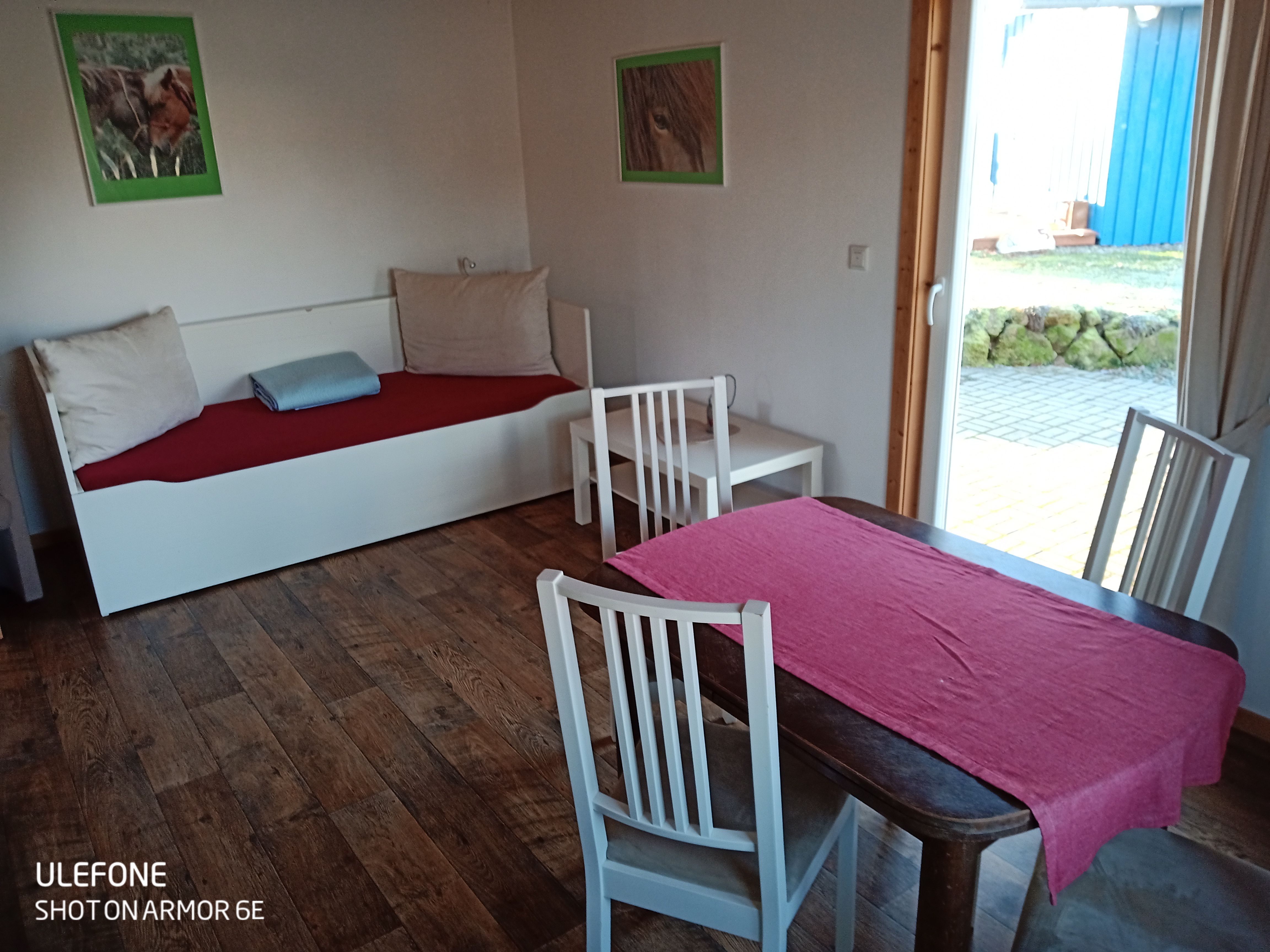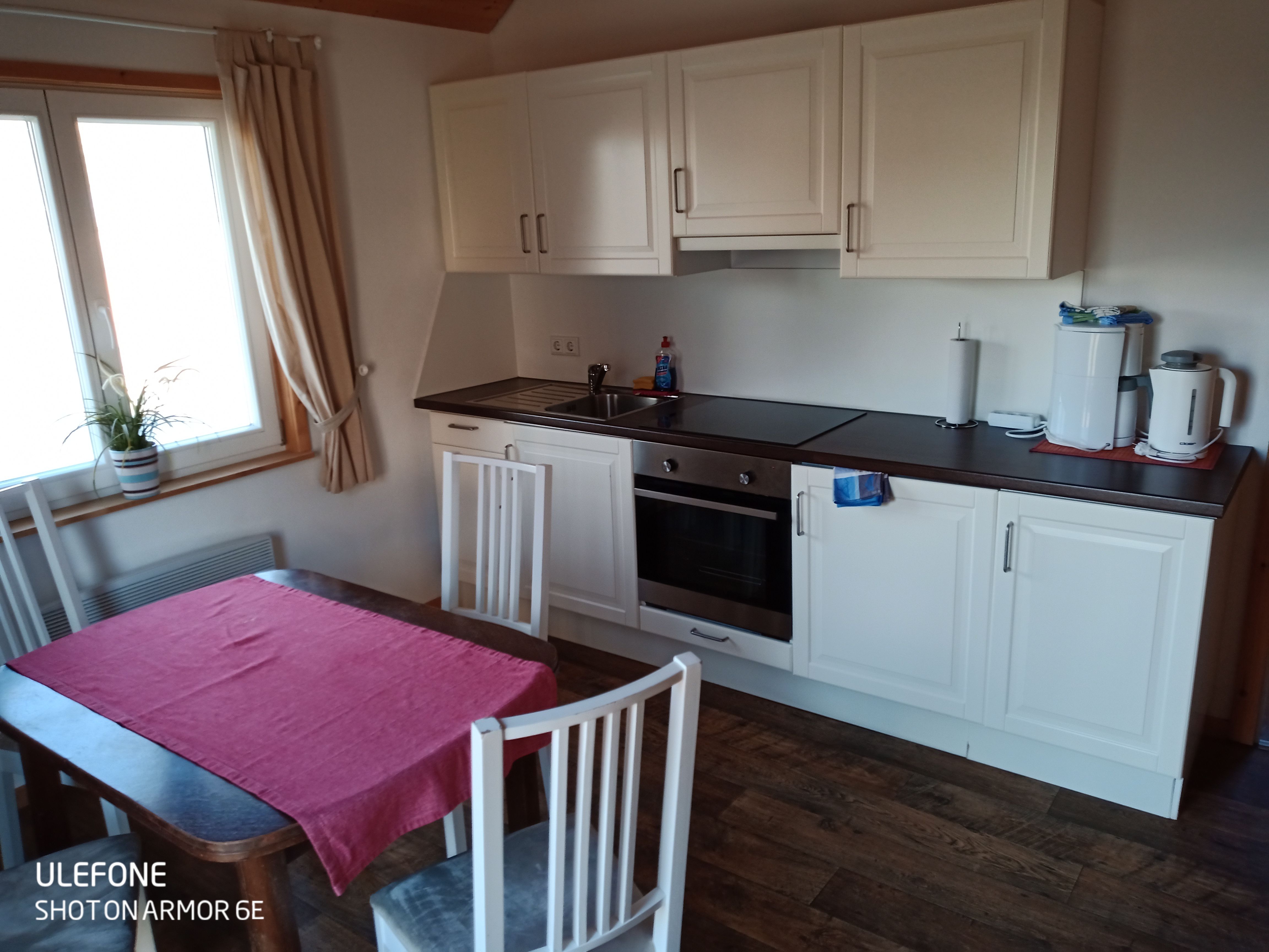Diese Haus verfügt über ein Schlafzimmer mit Doppelbett (1,8 x 2 m), darüber befindet sich ein Schlafboden (ein Traum für bis zu 2 Kids) mit zwei Matratzen. In dem Wohn-/ Essraum mit Küchenzeile befindet sich ein gemütliches 2er-Schlafsofa, welches als weitere Schlafmöglichkeit genutzt werden kann. Die Küchenzeile ist mit einem 4 Plattenkochfeld, Backofen, Spüle und Kühlschrank mit Gefrierfach komplett für 6 Personen ausgestattet. Das modere, geräumige Badezimmer verfügt über Dusche und WC. Über der Diele mit Gardrobe befindet sich ein weiterer Schlafboden für 2-3 Kinder. Alle Räume werden mit Elektroheizkörper beheizt, die eine schnelle angenehme Wärme verbreiten und somit ihr Aufenthalt im Haus auch für die "kältere" Jahreszeit gemütlich werden lässt. Das Haus hat eine Grundfläche von ca.44 qm zuzüglich den beiden Schlafböden.