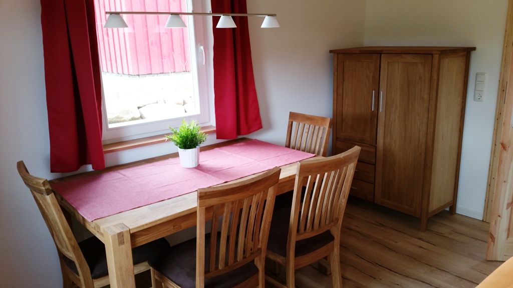 Dieses Ferienhaus verfügt über einen kombinierten Wohn-/Schlafraum mit einem Doppelbett (1,8 x 2m) und einer kleinen gemütlichen Sitzecke für 4 Personen. Im Vorraum befindet sich die Küchenzeile, sie ist mit einem 4 Plattenkochfeld und Backofen, Spüle und Kühlschrank, Kaffeemaschine und Wasserkocher komplett für 4 Personen ausgestattet. Das Haus ist mit Elektroheizkörpern beheizt die sehr schnell eine angenehme Wärme im Haus verbreiten. Es ist ideal für 2 Erwachsene mit max. 2 Kindern. Über eine Leiter geht es auf den Schlafboden für die Kinder. Hier befinden sich zwei bezogene Matratzen. Über ein Dachfenster lassen sich nachts die Sterne beobachten. Das Haus verfügt über ein modernes Badezimmer mit Dusche und WC. Die Grundfläche beträgt ca. 25 qm zuzüglich Schlafboden.