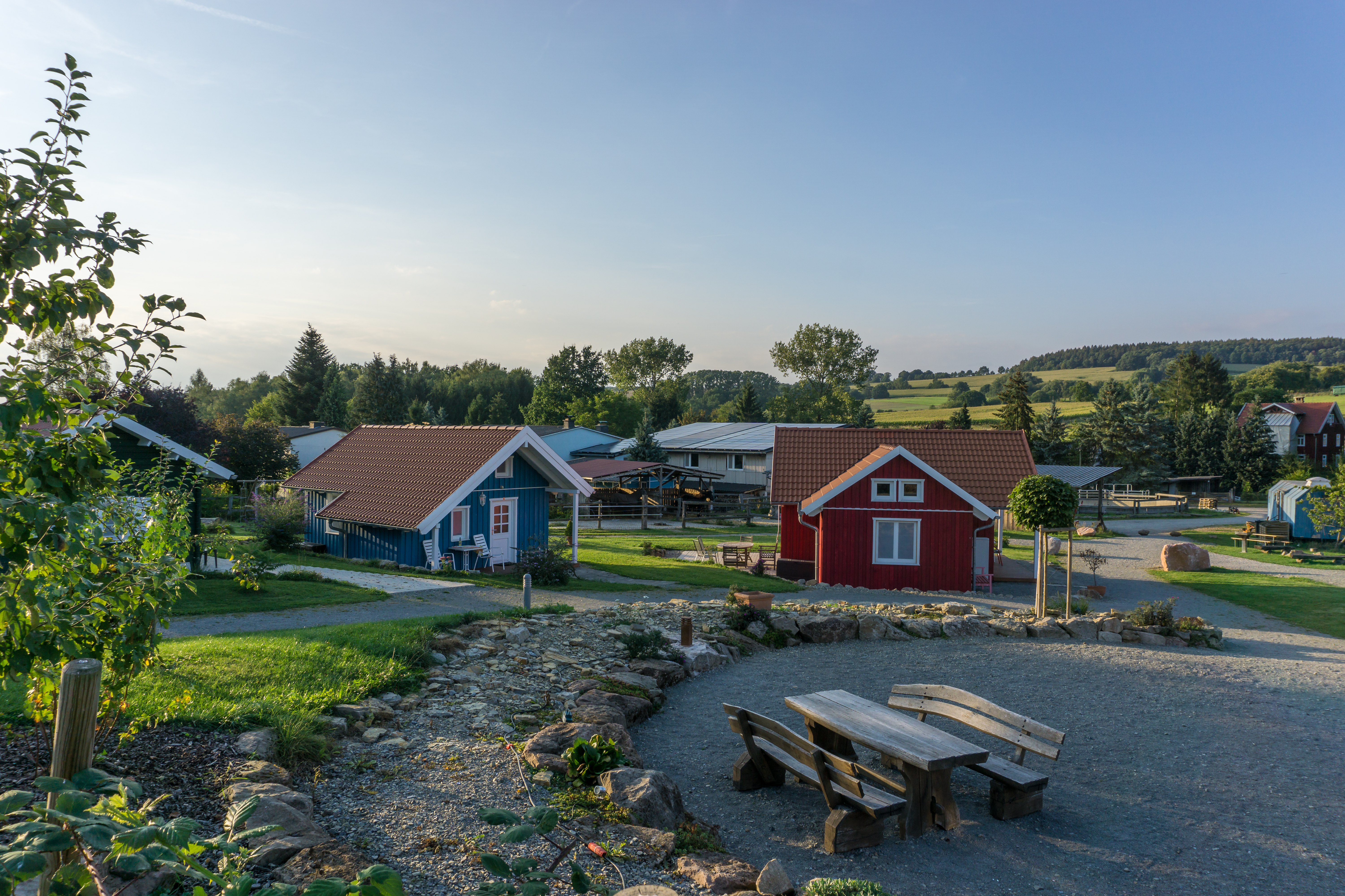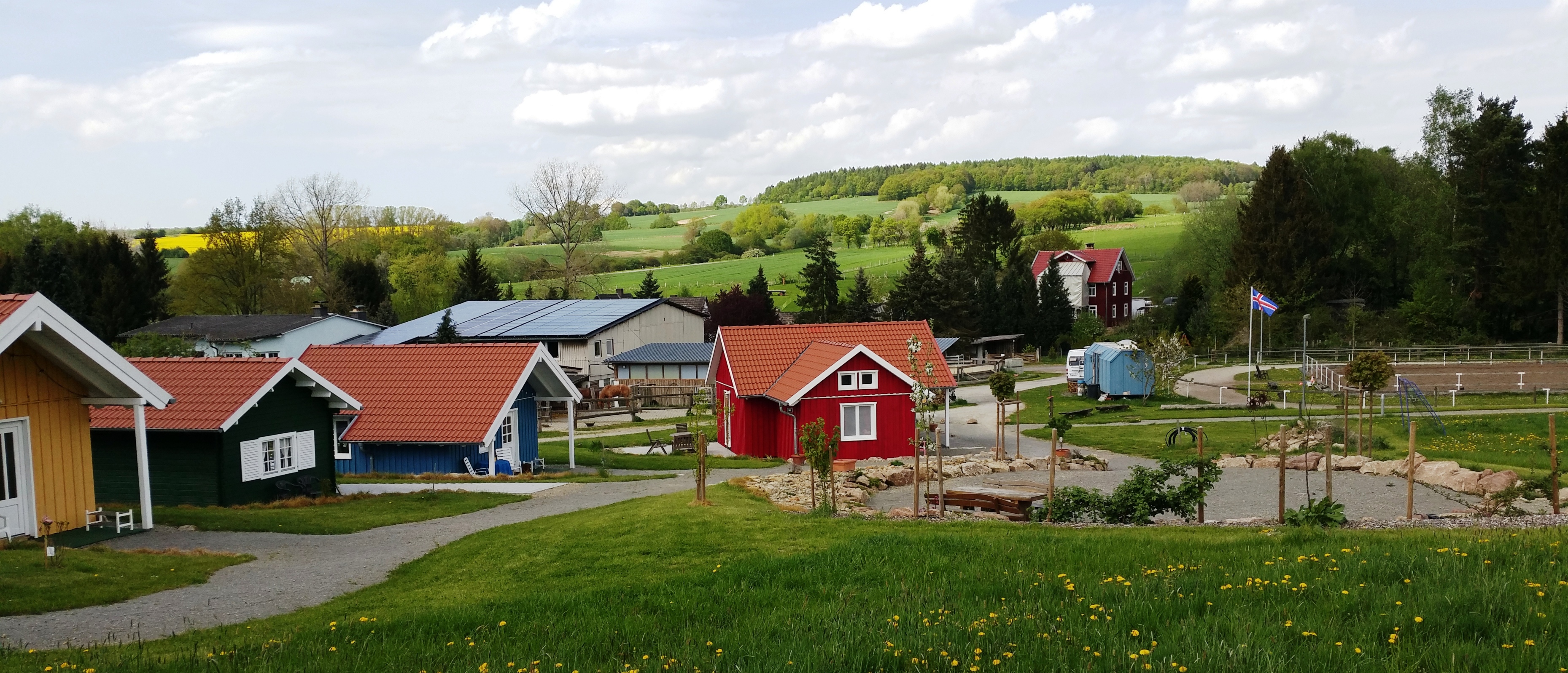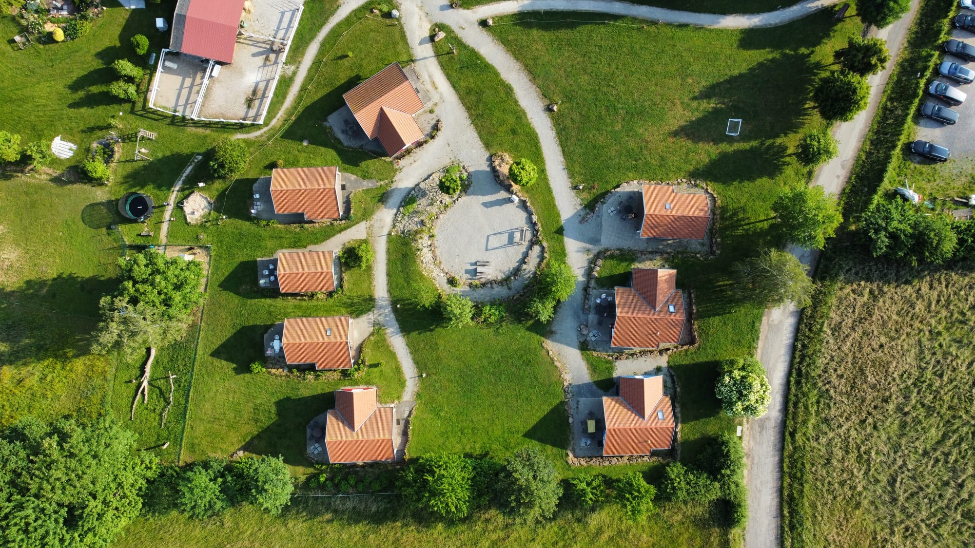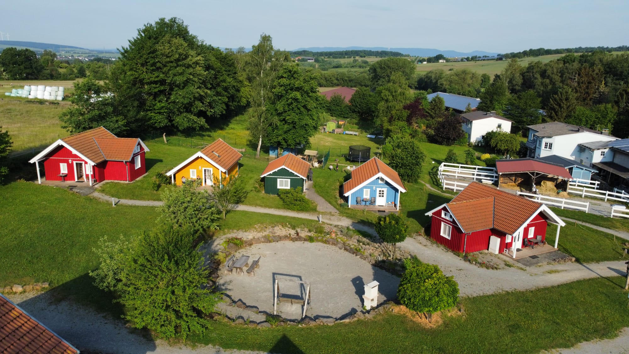 Unsere Ferienhäuser sind im "nordischen Stil" in Holzrahmenbauweise hergestellt. Alle Häuser verfügen ganz bewußt, weder über W-LAN noch Fernseher. Sie befinden sich direkt an Pferdekoppeln, Reitplatz und an dem Wanderweg "GrimmSteig". Auf unserem "kleinen Dorfplatz" befindet sich eine Hollywood-Schaukel und ein Grill mit einer rustikalen Eichenholz-Sitzgarnitur um den Tag gemütlich ausklingen zu lassen.