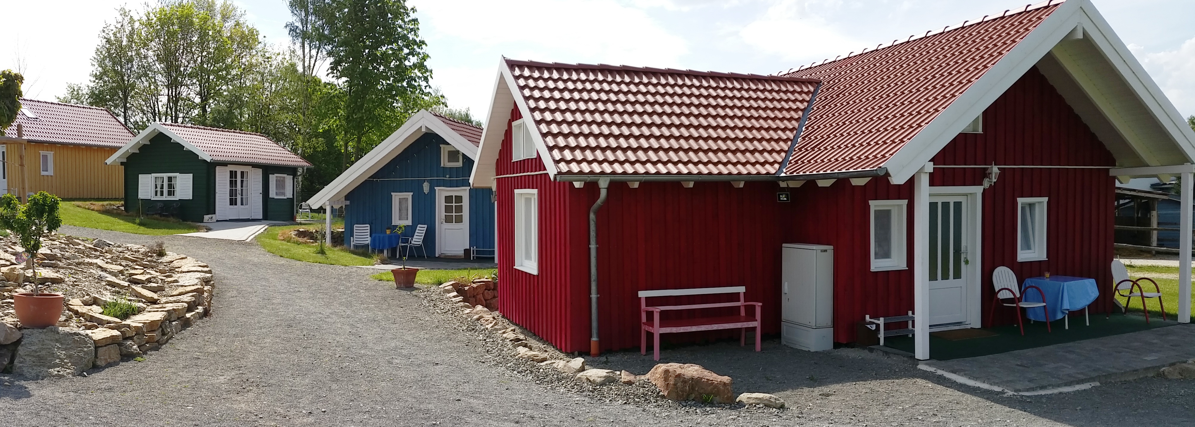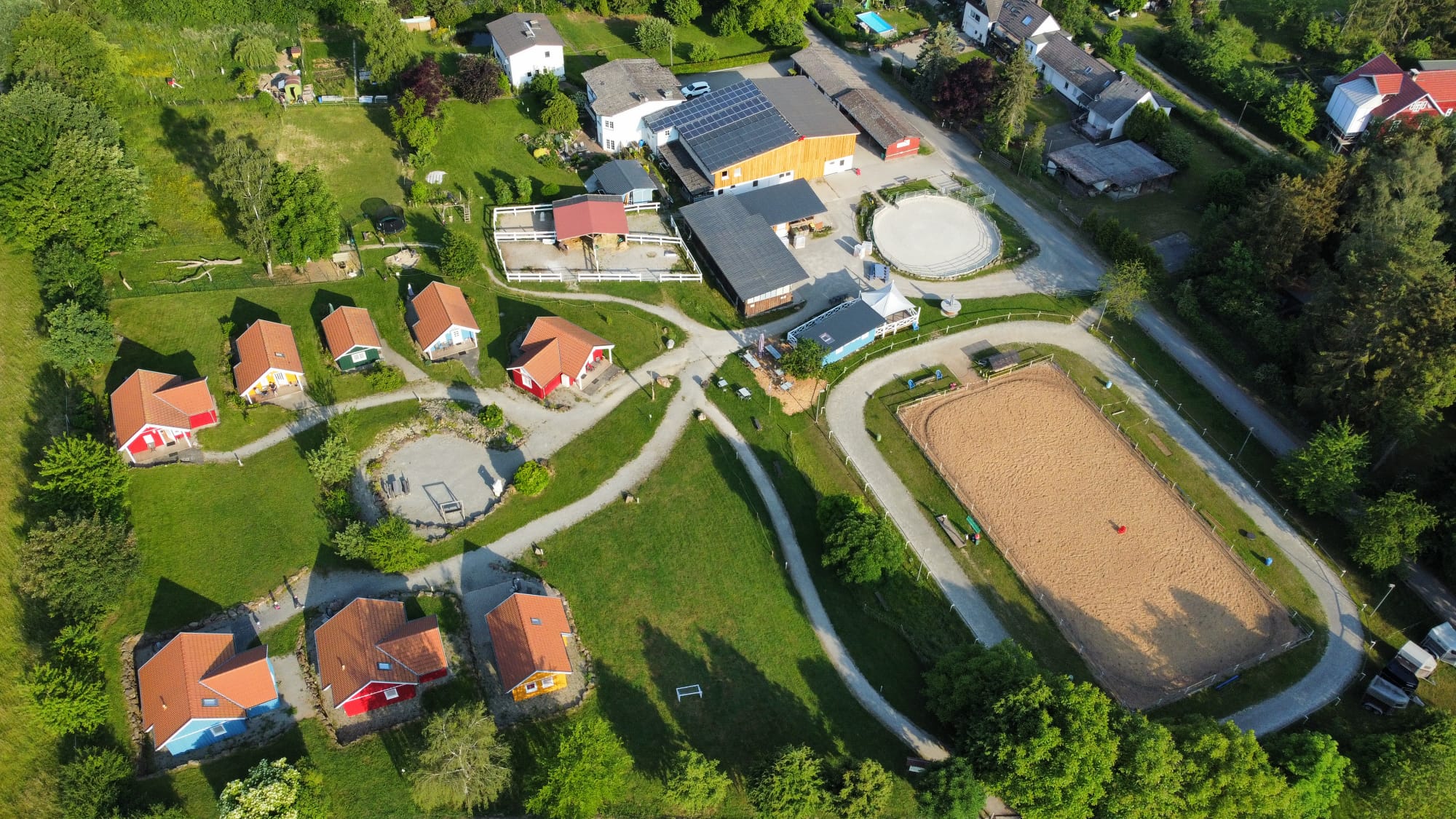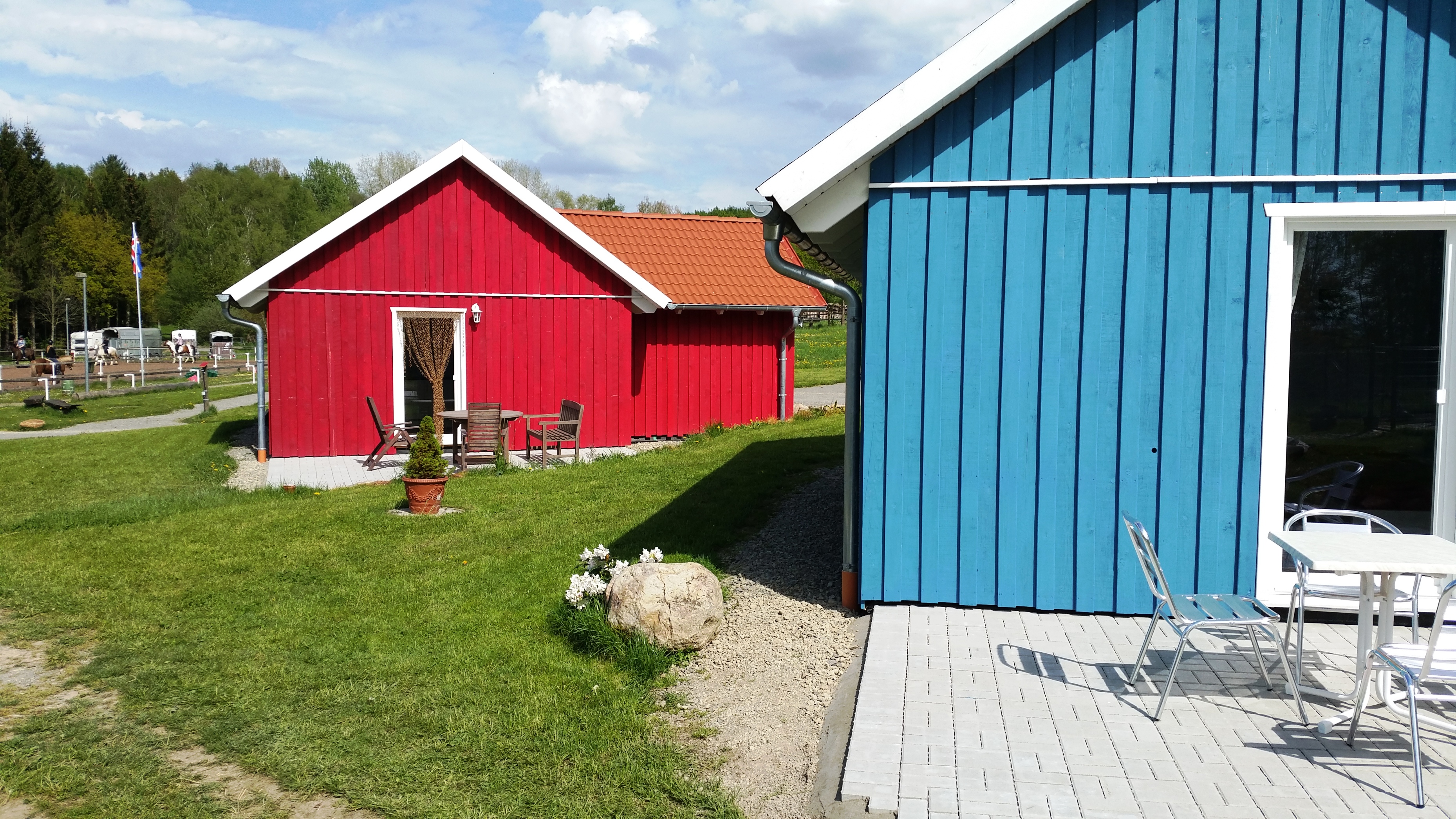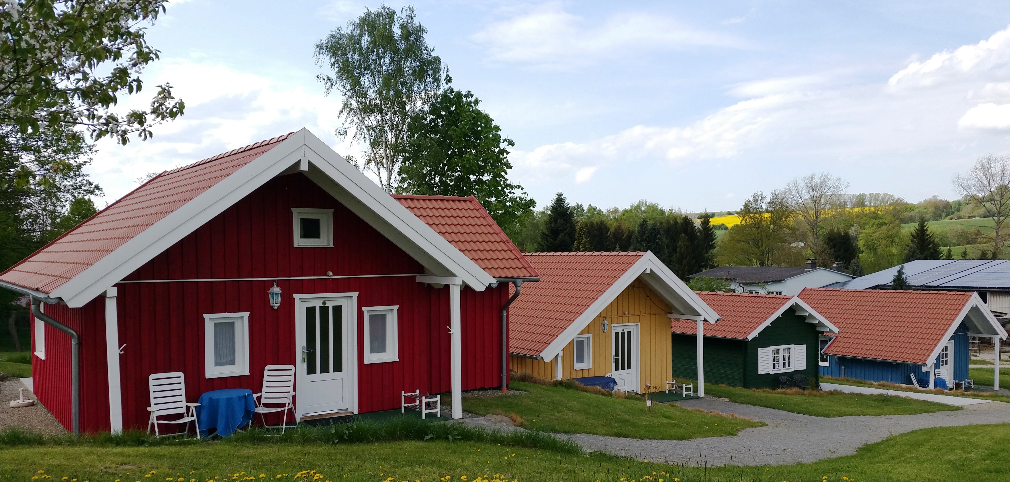 Unsere Ferienhäuser sind im "nordischen Stil" in Holzrahmenbauweise hergestellt. Alle Häuser verfügen ganz bewußt, weder über W-LAN noch Fernseher. Sie befinden sich direkt an Pferdekoppeln, Reitplatz und an dem Wanderweg "GrimmSteig". Auf unserem "kleinen Dorfplatz" befindet sich eine Hollywood-Schaukel und ein Grill mit einer rustikalen Eichenholz-Sitzgarnitur um den Tag gemütlich ausklingen zu lassen.